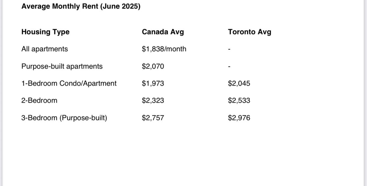 • Renting: Expect to pay CAD $2,000-$3,000/month for a 1–2 bedroom in Toronto/GTA. Other cities may cost $1,500–$2,300.